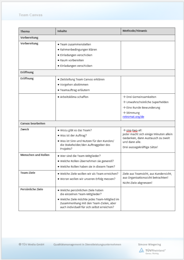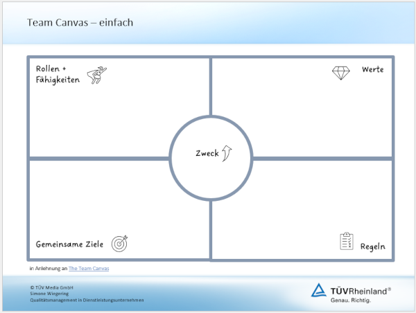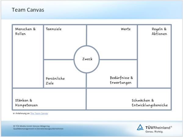 Die Erarbeitung eines Team Canvas hilft, Teams zusammenzuführen und auf eine gemeinsame Aufgabe zu konzentrieren. Ein Team Canvas ist besonders sinnvoll, wenn Teams sich aus unterschiedlichen Fachbereichen, Abteilungen und Ebenen zusammensetzen. Dann kann das Canvas einem QM-Team oder auch einem Projektteam helfen, zusammenzuwachsen und die Zusammenarbeit zu stärken.