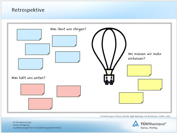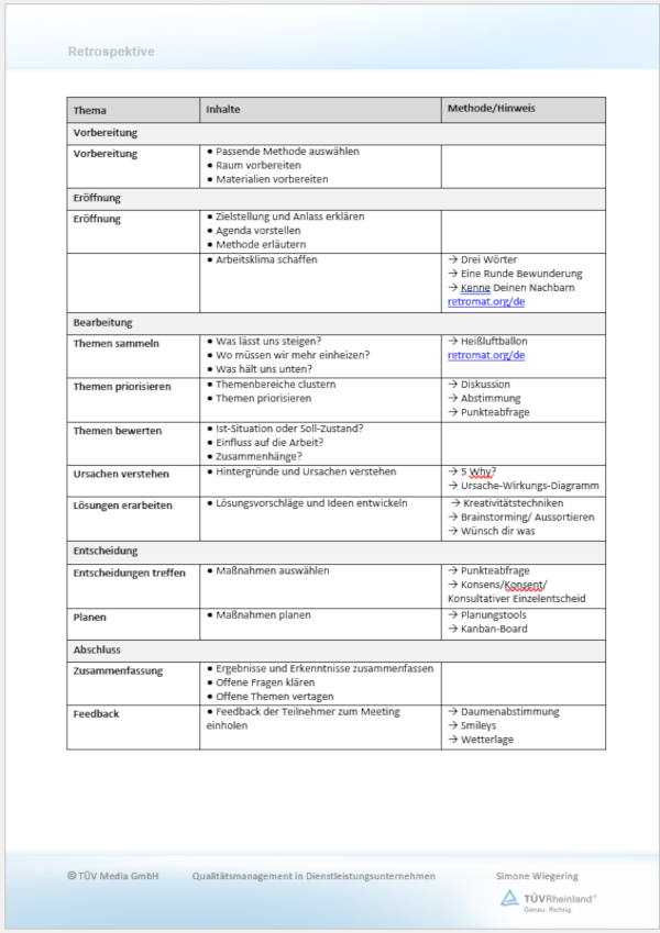 Das Team nimmt sich regelmäßig Zeit, um die Ergebnisse der Zusammenarbeit, aber auch die Vorgehensweise zu reflektieren. Über die Betrachtung von Erfolgen und Verbesserungsbedarf werden das kontinuierliche Lernen und schnelle Anpassungen gefördert.