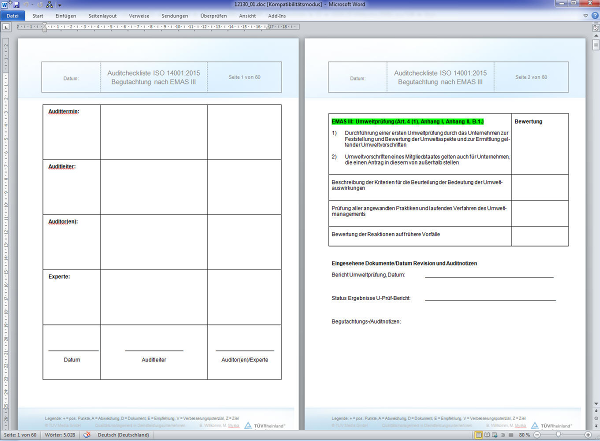 Die Frageliste korrespondiert mit der ISO 14001:2015 sowie mit EMAS III. Die EMAS-III-spezifischen Fragestellungen, die für eine Zertifizierung nach ISO 14001 nicht relevant sind, sind in der Liste entsprechend gekennzeichnet und können bei Bedarf einfach gestrichen werden.[