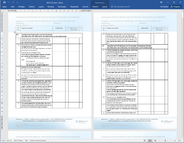 Ein Fragenkatalog zur internen Auditierung ist ein willkommenes Hilfsmittel, um die Varianz an Themen und Normforderungen durch entsprechende Fragen erfassen zu können. Dieses Hilfsmittel kann sowohl bei einer Überprüfung der dokumentierten Informationen als auch in Interviews verwendet werden. Nachweise und dokumentierte Informationen sowie Bemerkungen können im vorliegenden Fragenkatalog in den jeweiligen Spalten hinter der Frage notiert und bewertet werden.[