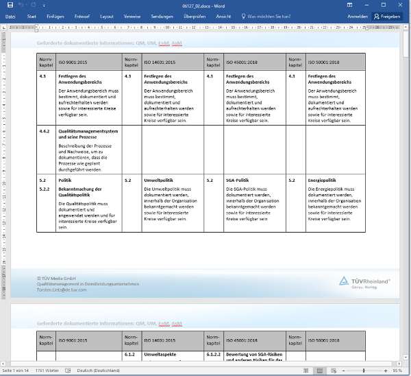Dieser Beitrag enthält einen umfangreichen Fragenkatalog, der die Anforderungen der Normen ISO 9001:2015, ISO 14001:2015 (mit Ergänzungen zur EMAS III), ISO 45001:2018 und ISO 50001:2018 in konkrete Fragen übersetzt. Eine separate Spalte dient zur Überprüfung, ob die geforderte dokumentierte Information vorliegt. Arbeitshilfen: von: |