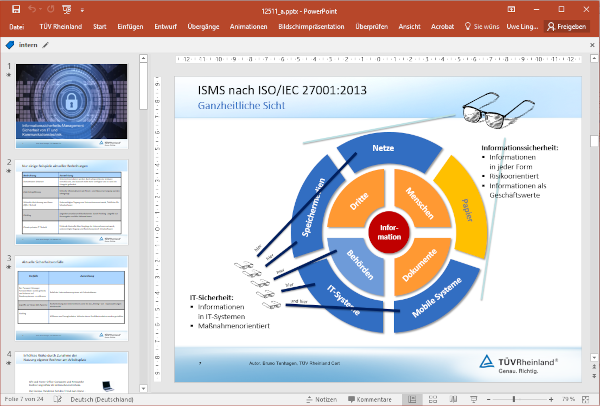 Die Präsentation eignet sich insbesondere zur Sensibilisierung und Motivation der an der Einführung des Informationssicherheits- Prozesses beteiligten Personen. So können Sie im Unternehmen für das Informationsicherheitsmanagement werben und das System und die Methoden bekannt machen. Die PowerPoint-Präsentation enthält insgesamt 24 Seiten. Auf den nächsten Seiten sind Auszüge hieraus abgebildet. Die Präsentation lässt sich an die eigenen Bedürfnisse anpassen.