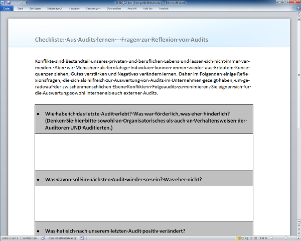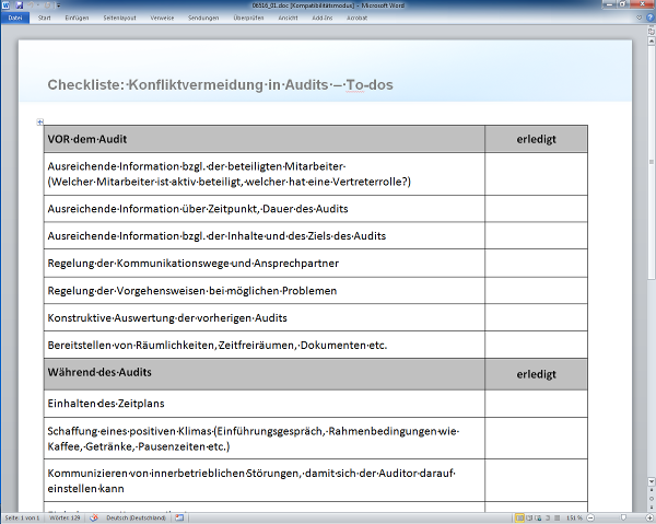 Gerade Audits bergen aufgrund der beteiligten Parteien, ihrer unausgesprochenen Prüfungssituation, der hinter ihnen verborgenen Abhängigkeiten (z. B. zwischen Kunde und Lieferant) etc. ein hohes Konfliktpotenzial. Dieser Beitrag soll das Wissen um die verschiedenen Konfliktarten, aber auch um Ursachen und das rechtzeitige Erkennen von Konfliktanzeichen vermitteln. Zusammen mit Ansätzen zur Konfliktbearbeitung ist dies ein sinnvolles und wichtiges Instrument für alle Betriebe. Darüber hinaus sollen Checklisten bei der Prävention von Audikonflikten helfen. Arbeitshilfen: Konflikte sind Bestandteil unseres privaten und beruflichen Lebens und lassen sich nicht immer vermeiden. Die Checkliste soll Ihnen jedoch dabei helfen solchen Konflikten vorzubeugen, die häufig vor, während und nach dem Audit auftreten und sich mit einfachen Mitteln vermeiden lassen. Konflikte sind Bestandteil unseres privaten und beruflichen Lebens und lassen sich nicht immer vermeiden. Aber wir Menschen als lernfähige Individuen können immer wieder aus Erlebtem Konsequenzen ziehen, Gutes verstärken und Negatives verändern lernen. Daher finden Sie in der Arbeitshilfe einige Reflexionsfragen, die sich als hilfreich zur Auswertung von Audits im Unternehmen gezeigt haben, um gerade auf der zwischenmenschlichen Ebene Konflikte in Folgeaudits zu minimieren. Sie eignen sich für die Auswertung sowohl interner als auch externer Audits. von: Vita:
