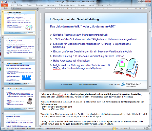 Beigefügt finden Sie einen kompletten Satz Präsentationsvorlagen, einschließlich Trainertexten, im PowerPoint-Format. Sie können diese Vorlagen sowohl für das Selbststudium als auch zur internen Schulung nutzen. In der nachfolgenden Abbildung ist eine Folie inkl. Trainertext beispielhaft abgebildet.[