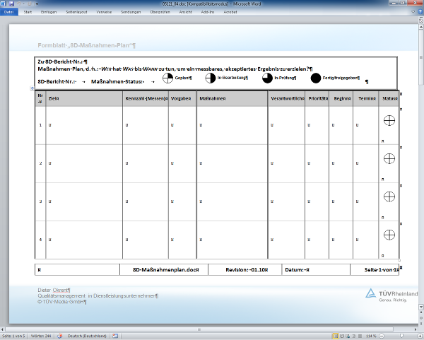 Das Handwerkliche beim arbeitsteiligen Erstellen des Handbuchs und der Flowcharts zur Prozessbeschreibung mit Microsoft- und Open-Office-Anwendungen auf Windows und Apple-Rechnern stellen dabei einen Schwerpunkt dar.