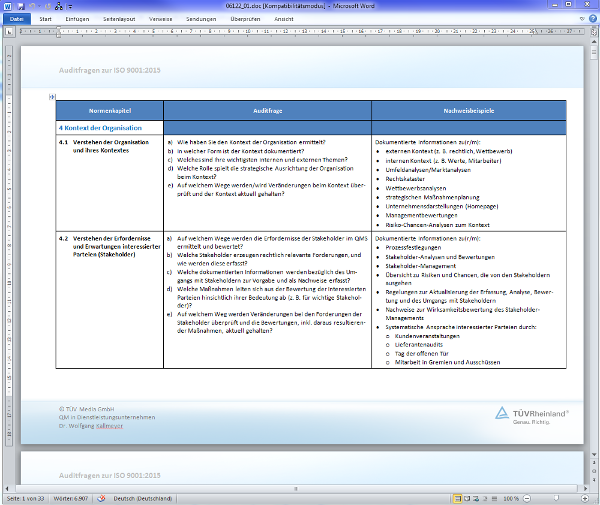 Zu Ihrer Zeitersparnis finden Sie einen direkt verwendbaren Auditfragenkatalog für das interne Systemaudit, basierend auf den Forderungen der ISO 9001:2015, beigefügt. Den Fragenkatalog können Sie an die Erfordernisse Ihrer Organisation anpassen und um firmenspezifische Belange ergänzen. Arbeitshilfen: von: |