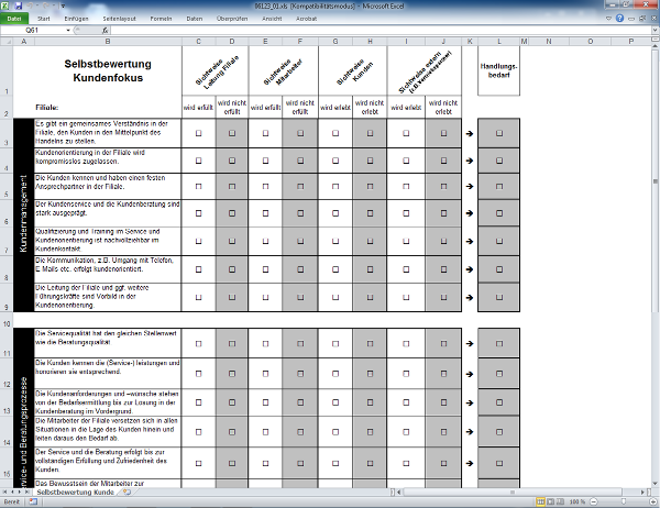 Natürlich müssen Vertriebs- und Beratungsprozesse sehr stark an den Erwartungen der Kunden orientiert sein. Zwar führen Kundenbefragungen, Testkäufe in Filialen etc. zu grundlegenden Erkenntnissen über die Zufriedenheit der Kunden, doch die Ursachenanalyse und die Etablierung einer nachhaltigen Kundenorientierung kommen meist zu kurz. Um ein dezidiertes Gesamtbild der Qualität in Filialen zu erhalten, fehlt in der Regel ein geeignetes kundennahes Instrument, um nicht nur zu messen, sondern auch zielgerichtet Ursachen festzustellen und Maßnahmen individuell für jede Filiale umzusetzen. Zur Bewertung bietet sich eine Selbstbewertung und Auditbewertung an.